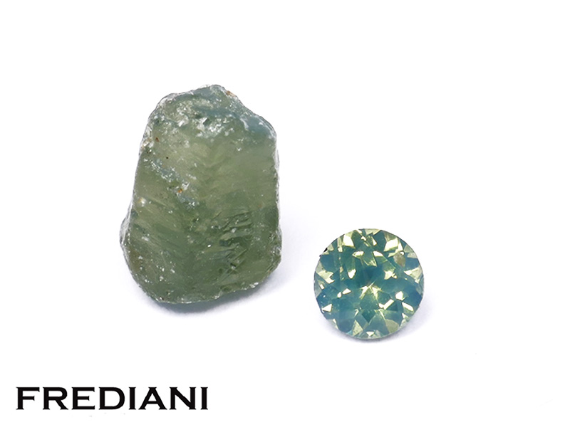 Très beau Saphir vert d’Auvergne naturel rond 0.15 carat + saphir brut offert.